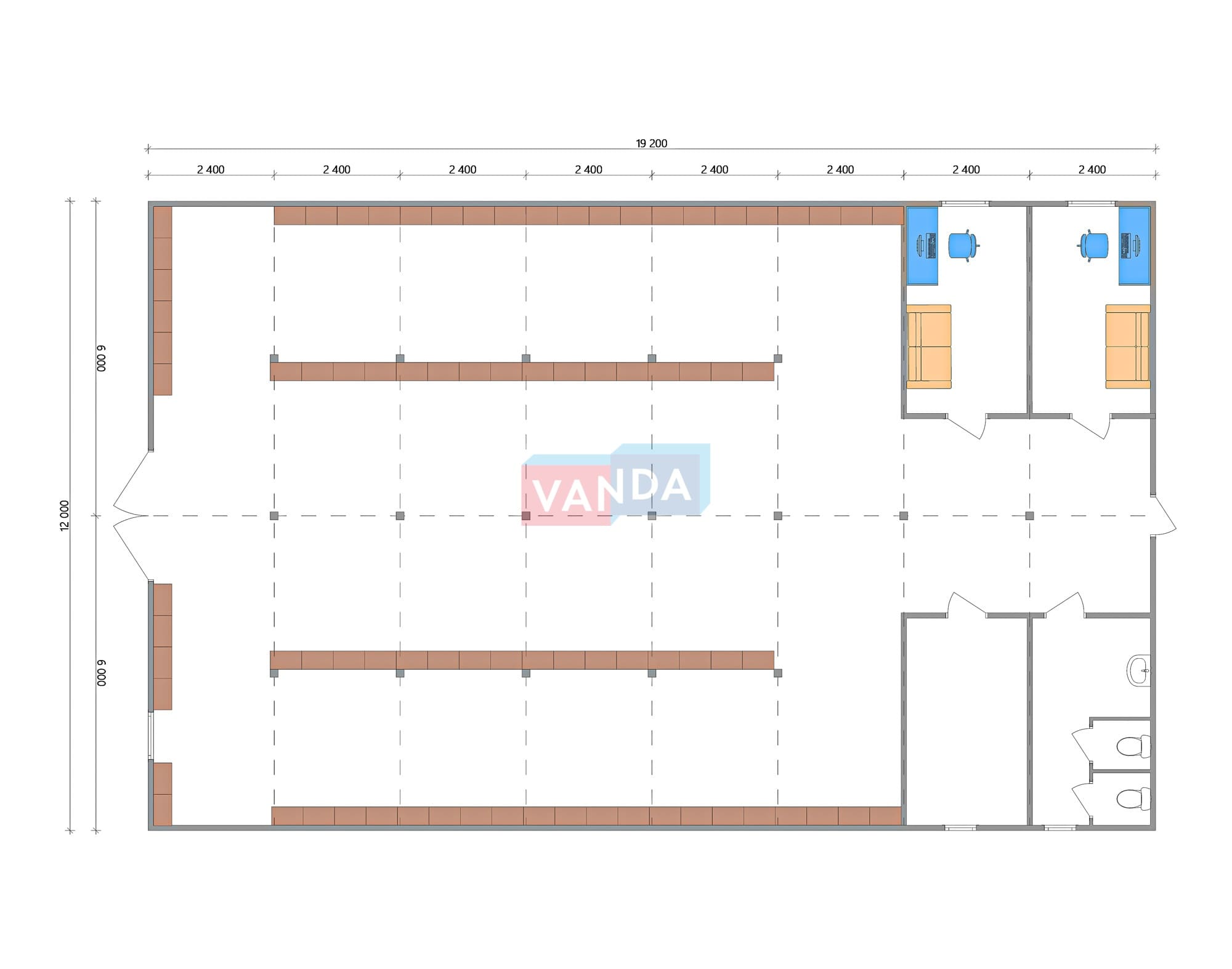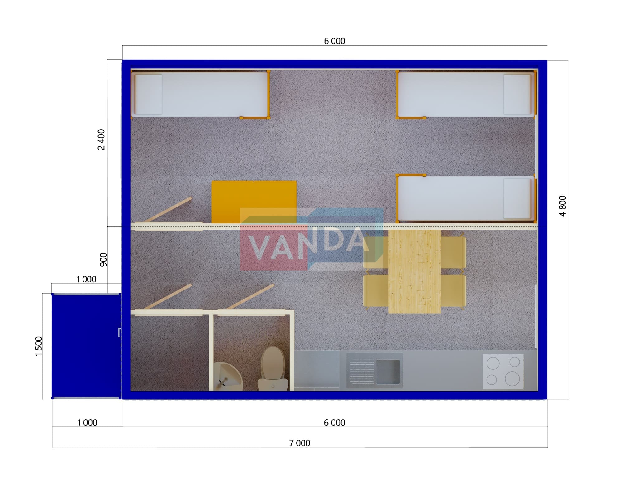 Модульная бытовка с плоской крышей 7.2x6.0 7.2x6.0 43.2 OSB 9 мм. Оцинкованный профлист 650 000 р. Уточняйте у менеджера